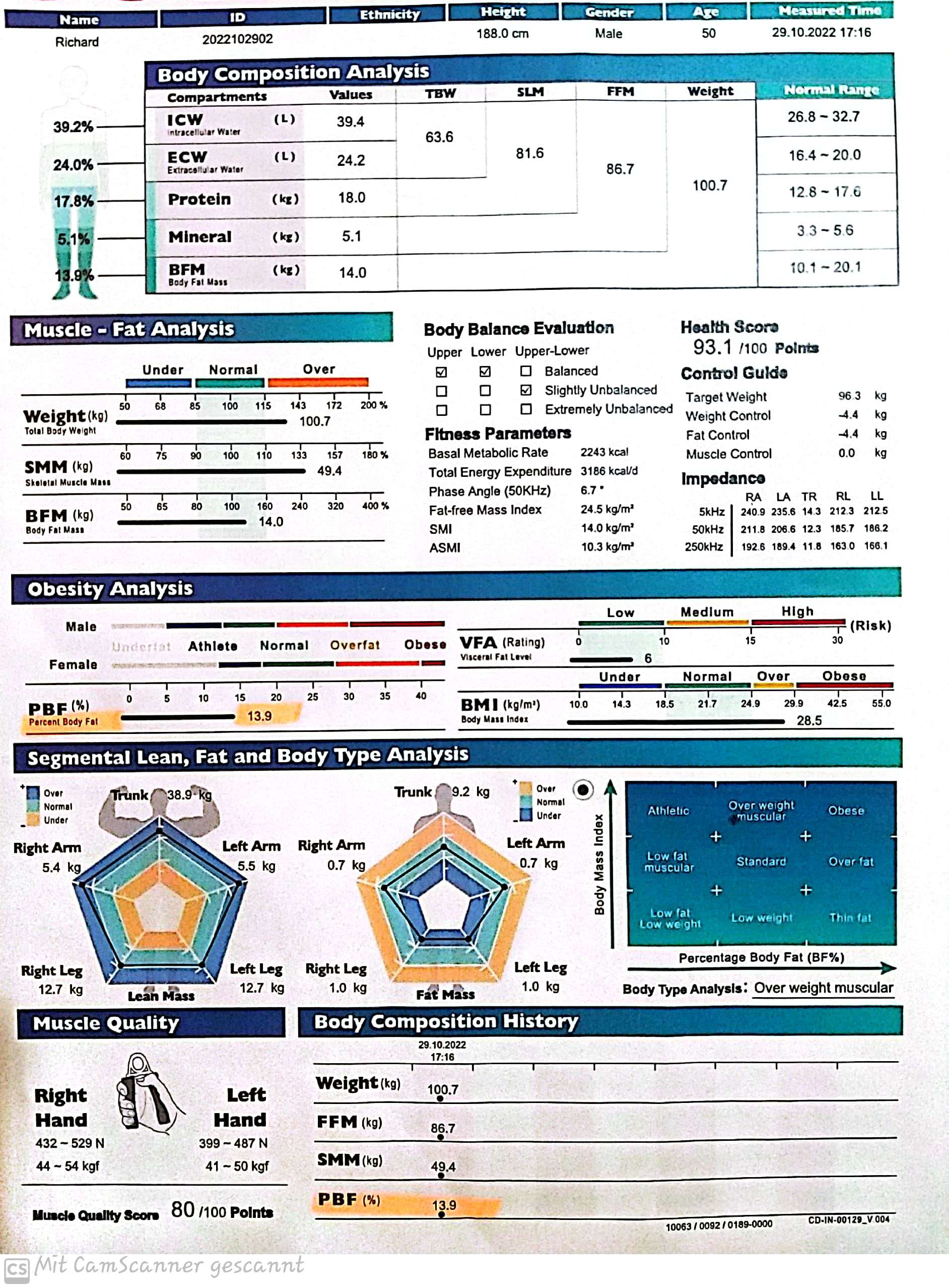 Mit einem Gewicht von 112 kg (188cm Körpergröße) und einem starken Körperfettanteil von ca. 30 Prozent. Endete im Sommer 2022 mit energiegeladene 95 kg. Bei einem Fettgehalt von 12,7 Prozent. In dieser Zeit lernte ich meinen Körper bis in die letzte Zelle kennen. Somit stehe ich auch hinter meinen therapeutischen Ansätze aus Erfahrung zu 100 Prozent. Weil sie wirken und funktionieren.: